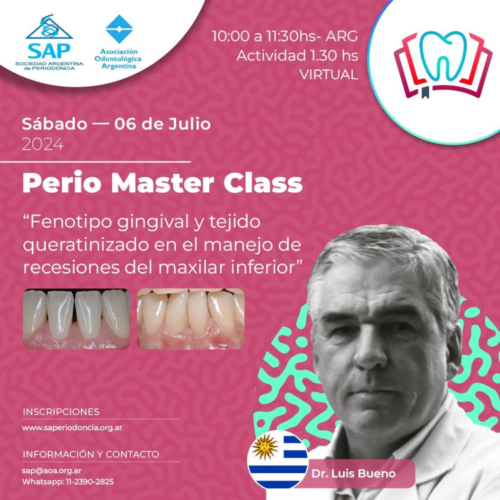 El próximo sábado 6 de julio, el Dr. Luis Bueno, dictará una exclusiva Master Class sobre el «Fenotipo gingival y tejido queratinizado en el manejo de recesiones del maxilar inferior», compartiendo sus conocimientos y perspectivas sobre este tema clave.